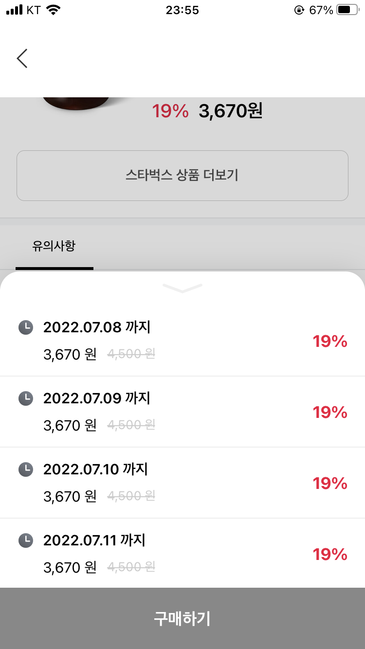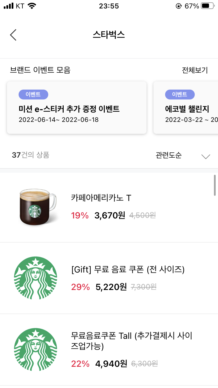 스타벅스 아메리카노의 경우 거의 20% 할인 금액에 구매할 수 있다.